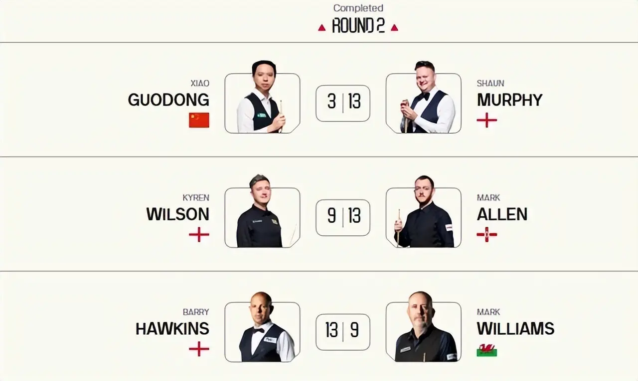 同一比赛日进行的其余场次:马克艾伦13-9淘汰凯伦威尔逊全国股票配资平台官网,接下来将与巴里霍金斯争夺一个4强席位;尼尔罗伯逊4-1领先被韦克林连扳三局追到4-4平(第一阶段);赵心童9-7领先丁俊晖(第二阶段);特鲁姆普4-4战平瓦菲(第一阶段)。